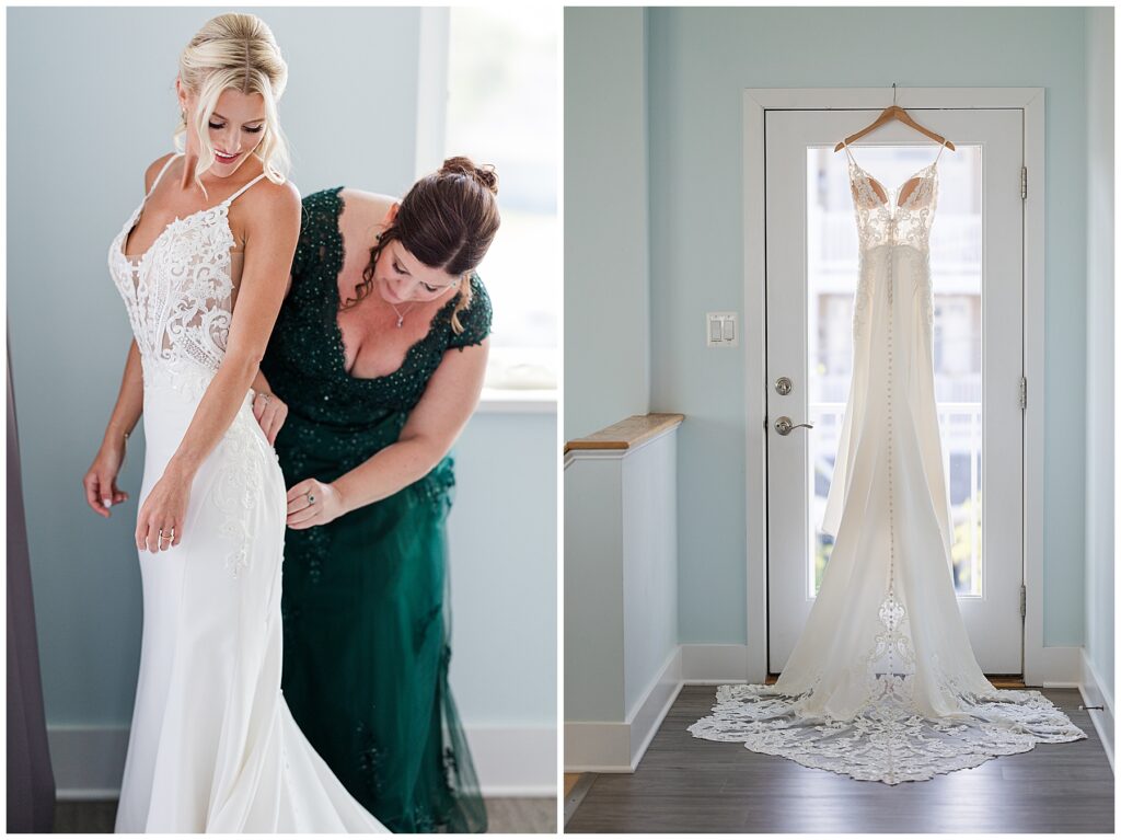 Kaitlin spent the morning surrounded by her bridesmaids, who looked stunning in their deep green dresses. The soft tones of the dresses paired so beautifully with the natural greenery and sea grass just outside. Every detail felt thoughtful and intentional—from her white and green florals to the coastal-inspired details woven throughout the day. Watching Kaitlin step into her gown, the room fell quiet for a moment. She looked radiant, and I couldn’t wait to capture Eric’s reaction when he saw her for the first time.